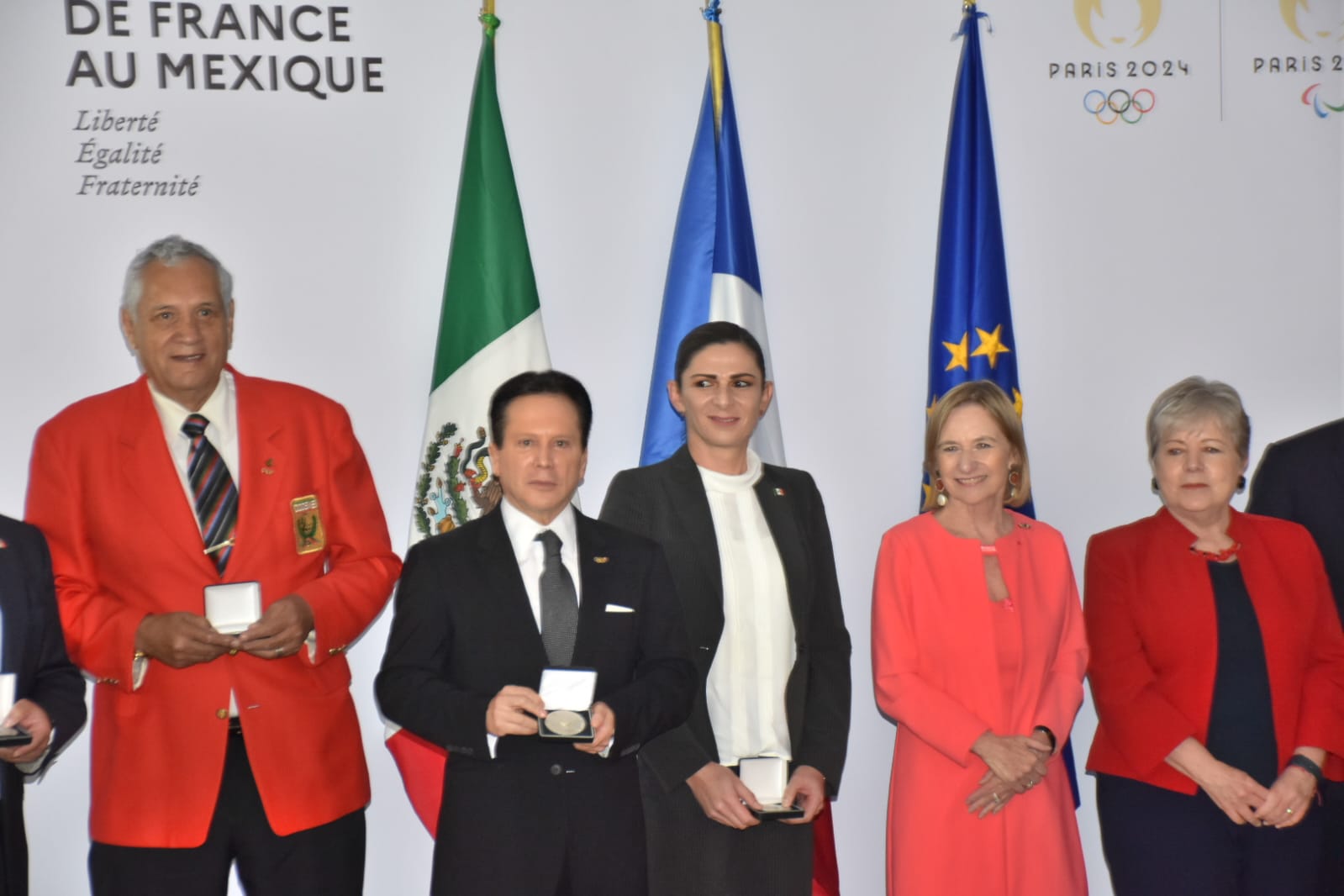 Daniel Aceves Villagrán, medallista olímpico en Los Ángeles 1984; Ana Gabriela Guevara, en Atenas 2004; Jesús Mena Campos, Seúl 1988; Carlos Mercenario, Barcelona 1992; Joaquín Rocha Herrera, México 1968; Joel Sánchez, en Sydney 2000 y Bernardo Segura, en Atlanta 1996, recibieron una presea de manos de la embajadora Delphine Borione a nombre del gobierno de Francia.