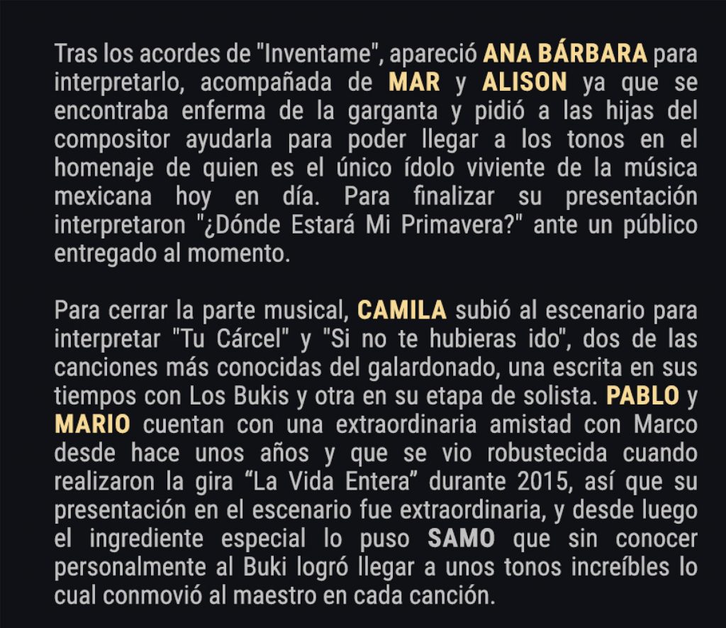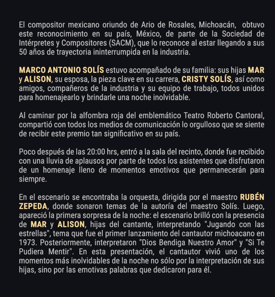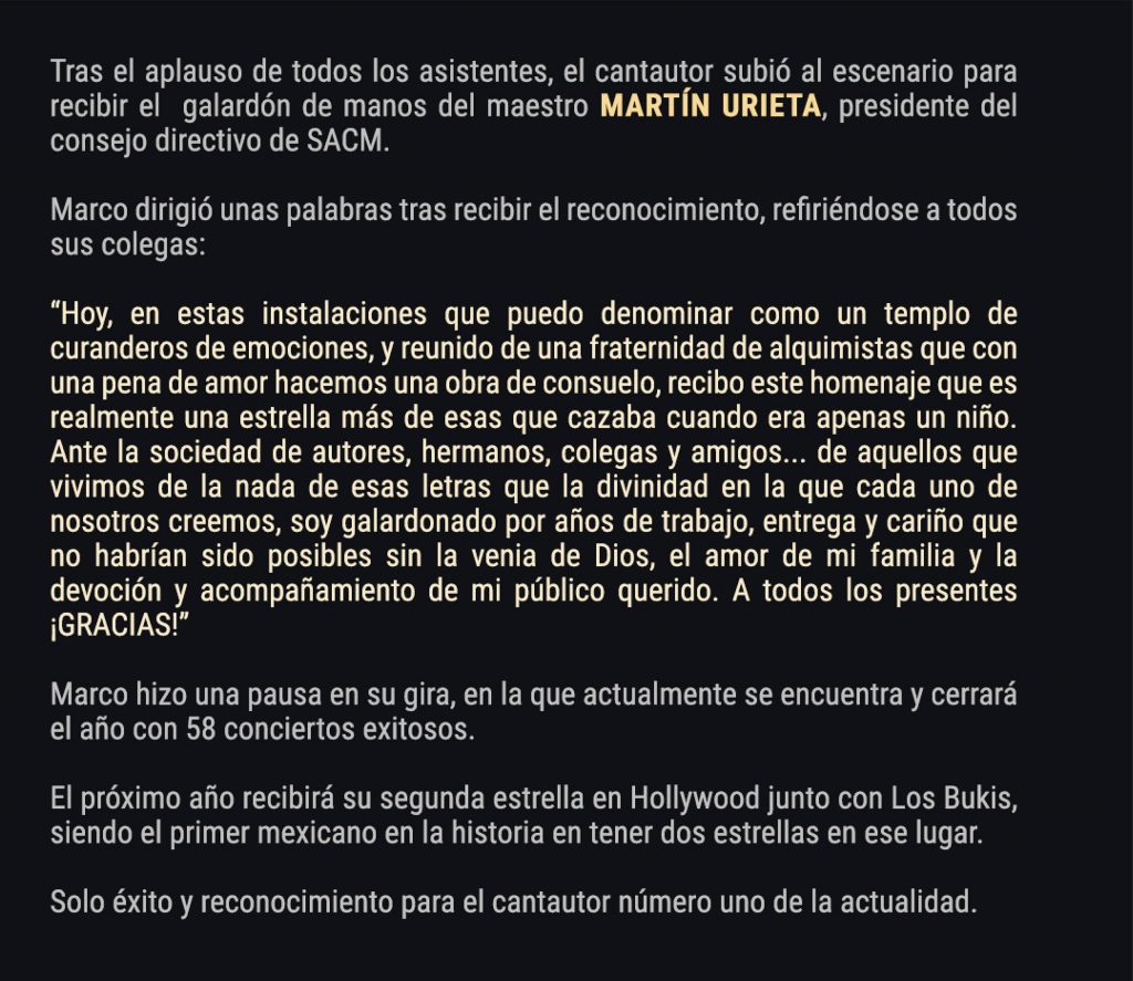 Espectáculos Marco Antonio Solís recibió el premio “Gran Maestro” del SACM Saúl Robledo 20 octubre, 2024 Continue Reading Previous Previous post: Marco Alonzo Verde asiste al juego de MLB VIPS GAMES en México.Next Next post: México gana medalla de bronce en la Copa del Mundo de Tiro con arco en Tlaxcala Deja un comentario Cancelar respuestaTu dirección de correo electrónico no será publicada. Los campos obligatorios están marcados con *Comentario * Nombre * Correo electrónico * Web Guardar mi nombre, correo electrónico y sitio web en este navegador para la próxima vez que haga un comentario. Más Noticias En su séptima temporada vuelve el Reality mexicano del Drag Queen Draga 1 octubre, 2025 Mia regresa a la escena musical con nuevo material 26 septiembre, 2025