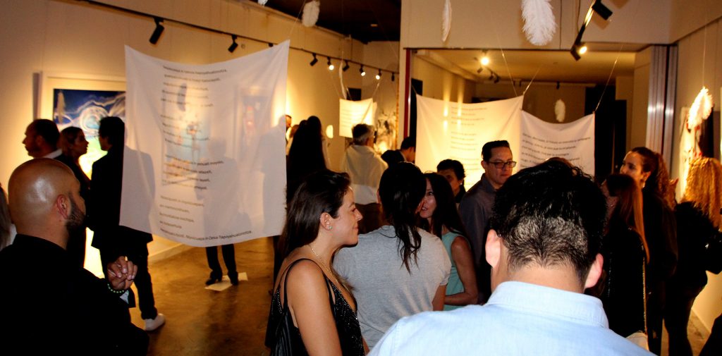 Esta exposición fue armonizada con tranquilidad y serenidad , donde las obras se mezclan con poemas de autores famosos de cada continente y con plumas blancas que simbolizan la paz, la purificación y la comunicación de los espiritus.