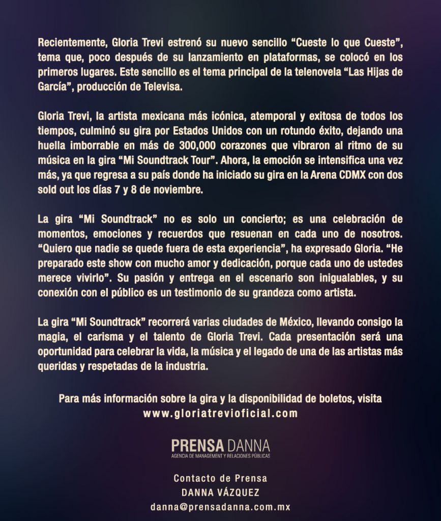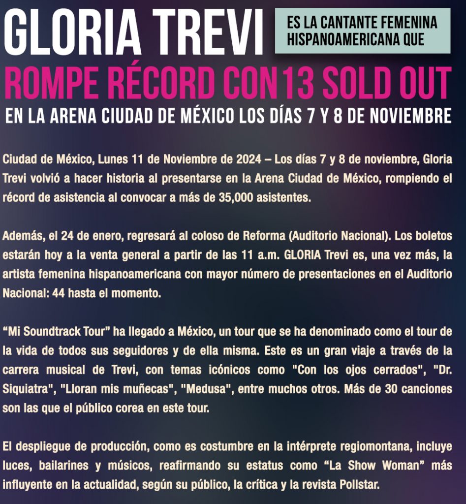 Espectáculos Gloria Trevi rompe récord con 13 conciertos vendidos en la Arena Ciudad de México Saúl Robledo 15 noviembre, 2024 Continue Reading Previous Previous post: Horacio Palencia, Fiel a mi esencia su nuevo EPNext Next post: México albergará selectivo de luchas para Asunción 2025 Deja un comentario Cancelar respuestaTu dirección de correo electrónico no será publicada. Los campos obligatorios están marcados con *Comentario * Nombre * Correo electrónico * Web Guardar mi nombre, correo electrónico y sitio web en este navegador para la próxima vez que haga un comentario. Más Noticias En su séptima temporada vuelve el Reality mexicano del Drag Queen Draga 1 octubre, 2025 Mia regresa a la escena musical con nuevo material 26 septiembre, 2025