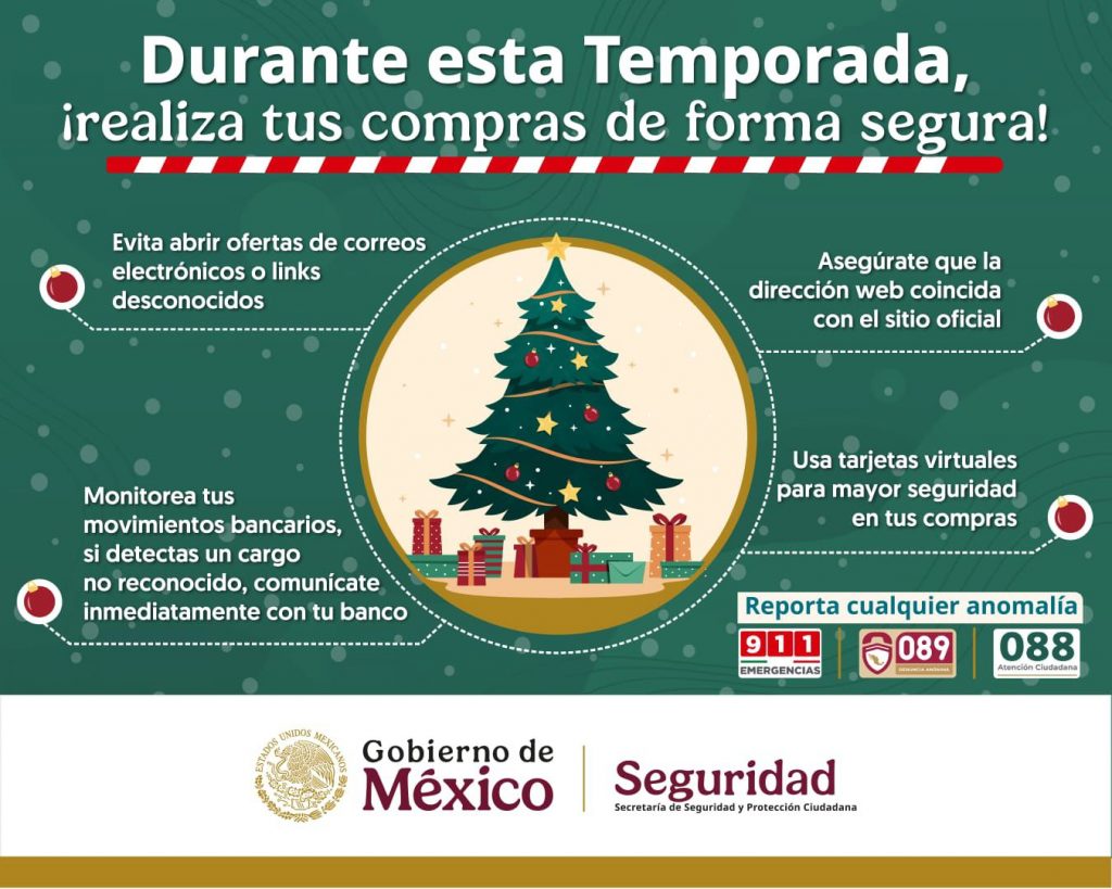 En temporada decembrina, los comercios y plataformas digitales que ofrecen productos y servicios, dan a conocer descuentos y promociones, por lo que la Secretaría de Seguridad y Protección Ciudadana (SSPC), a través de la Dirección General de Gestión de Servicios, Ciberseguridad y Desarrollo Tecnológico, invita a la ciudadanía a tomar precauciones y estar alerta para evitar ser víctimas de ciberfraudes o ciberataques.