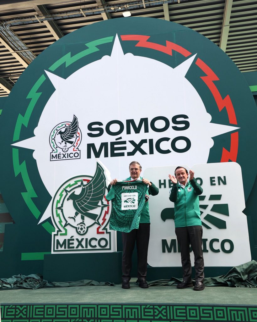 Durante la presentación, Marcelo Ebrard entregó el distintivo “Hecho en México” a la Selección Nacional, reconocimiento que otorga la Secretaría de Economía a las instituciones que promueven la competitividad, la identidad nacional y el fortalecimiento económico a través de sectores estratégicos como el deporte.